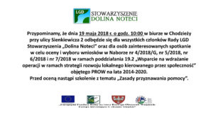 W dniu 19.05.2018 r. w biurze przy ul. Sienkiewicza 2 w Chodzieży odbyło się posiedzenie rady Organizacyjnej Stowarzyszenia “Dolina Noteci” w sprawie oceny wniosków w naborach 4/2018/G, 5/2018, 6/2018 i 7/2018. Przed posiedzeniem odbyło się szkolenie pn. “Zasady przyznawania pomocy”. Miło nam poinformować, że catering na posiedzenie rady przygotowała nam “Przystań Rybna” Pani Roksany, która …