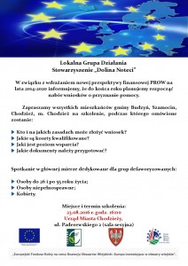 18 sierpnia w Gospodarstwie Agroturystycznym Państwa Woźniczków – Polna 6 w Szamocinie odbyło się szkolenie zamknięte dla Rady Organizacyjnej, Komisji Rewizyjnej, Zarządu oraz pracowników Biura Stowarzyszenia. Składało się ono z dwóch bloków tematycznych: Wdrażanie Lokalnej Strategii Rozwoju “Doliny Noteci” na lata 2014-2020 Podstawowe dokumenty LGD związane z LSR; Cele,wskaźniki, regulaminy, karty ocen; Zasady przyznawania pomocy …