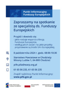Uprzejmie informujemy, że Punkt Informacyjny Funduszy Europejskich w Pile organizuje w dniu 08.10.2024 r. Mobilny Punkt Informacyjny w: – Starostwie Powiatowym w Chodzieży w godz. 08:00-10:30. Podczas dyżuru zainteresowani Funduszami Europejskimi będą mogli uzyskać informacje m.in. na temat: – dotacji i pożyczek na otwarcie i rozwój działalności gospodarczej, – wsparcia finansowego wynikającego z bieżących harmonogramów, – …