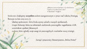 W dniu 07.06.2023 r. w Urzędzie Marszałkowskim Województwa Wielkopolskiego została złożona Lokalna Strategia Rozwoju na lata 2023-2027, która wytycza kierunek działań i rozwoju naszego obszaru przez najbliższy czas. Teraz czekamy na jej ocenę. Pragniemy podkreślić, iż jest to roczna praca wielu osób, bez których ten bardzo ważny dokument nie mógłby powstać. Serdecznie dziękujemy wszystkim, którzy nas …