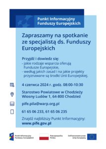 Punkt Informacyjny Funduszy Europejskich w Pile organizuje w dniu 04.06.2024 r. Mobilny Punkt Informacyjny w: – Starostwie Powiatowym w Chodzieży w godz. 08:00-10:30. Podczas dyżuru zainteresowani Funduszami Europejskimi będą mogli uzyskać informacje m.in. na temat: – dotacji i pożyczek na otwarcie i rozwój działalności gospodarczej, – wsparcia finansowego wynikającego z bieżących harmonogramów, – wsparcie na szkolenia …